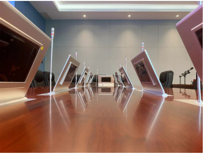 在12人的會議圓桌這里,安裝了12套WZH-L2LM 15.6"嵌入升降式無紙化終端,帶有電子桌牌和升降鵝頸發言話筒。它們具有銘牌顯示、文件批注、同屏廣播、分組廣播、異步瀏覽、跟蹤主講、外接信號顯示、臨時文件、主席控制等多種強大的功能;支持一鍵切換到Windows桌面,將Windows或其他軟件的操作界面同屏顯示到其它無紙化終端和大屏幕。
