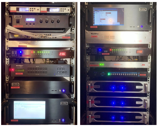 使用了兩只PAL83線性陣列音柱作為主擴音箱,嵌入式安裝于大屏幕兩邊,天花安裝了6只CM-6吸頂補聲音箱(分兩只一組,共3組),搭配3臺H1功放進行揚聲器功率放大。整體上既保證了現場擴聲均勻度,又能與環境融為一體,視覺上顯得