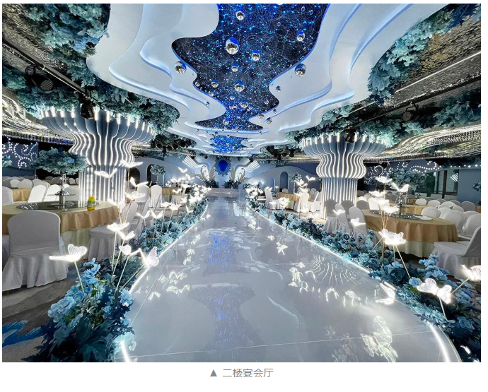首山湖藝術宴會酒店設計極富有現代藝術感,在交錯的時光和空間的藝術中,融入了別具一格的設計美學。藝術宴會中心二樓宴會廳,摒棄了絢麗繽紛的顏色,以星空藍和莫蘭迪灰為主體顏色設計,化繁為簡歸為本真,可同時容納300人。