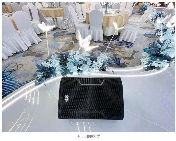 三樓宴會禮堂:考慮到聽音區域的直達聲覆蓋,能最大程度的減少多余混響能量的影響,擴聲系統選了具備良好指向性控制和高能量聲壓輸出的WLA-210X線陣音箱,聲壓級可達138dB,專業設計的聲學網罩,確保優化中、高頻的精準指向性,波導出口設計幾乎延伸到箱體的頂部和底部以創建高品質連續的聲音輸出,有效的減少陣列內的無效發聲和干擾。采用WLA-210X SUB雙15"線陣次低頻音箱,最大聲壓級可達145dB,搭配WLA-210X線陣音箱分別以6+1/組的組合形式懸掛于舞臺兩側,組成左右聲道主擴聲線陣系統。