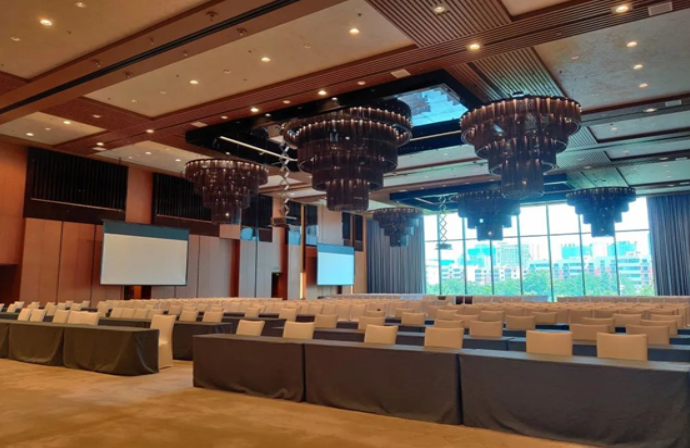 酒店的大宴會(huì)廳位于酒店二樓,場(chǎng)地面積1100平米,層高8米。現(xiàn)場(chǎng)擴(kuò)聲采用了EV的12寸吸頂音箱,均勻的聲場(chǎng)分布,充足的聲壓級(jí),讓大宴會(huì)廳舉辦的活動(dòng),無(wú)論是會(huì)議還是宴會(huì),擴(kuò)聲都得到了保證。因?yàn)閳?chǎng)地天花內(nèi)設(shè)備管道眾多,施工時(shí)使用了更薄的方形箱體,在不破壞裝修的情況下,節(jié)省了空間,更加的美觀。