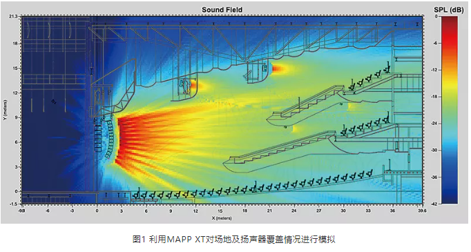 當(dāng)獲得足夠的場(chǎng)地信息之后,需要利用揚(yáng)聲器廠家提供的模擬軟件(或者通過Ease Focus這種基于GLL文件的通用設(shè)計(jì)軟件)進(jìn)行建模,這些軟件可在可視化的條件下,實(shí)時(shí)調(diào)整并計(jì)算不同設(shè)計(jì)方案的覆蓋均勻度以及聲壓級(jí)分布,較為復(fù)雜的模擬軟件(如Ease)甚至可以將反射和墻面材質(zhì)的吸聲特性都考慮在內(nèi),實(shí)現(xiàn)對(duì)反射情況的模擬(見圖1)。系統(tǒng)建模和預(yù)測(cè)的重要作用在于讓系統(tǒng)工程師在裝臺(tái)開始之前就能夠做好全部的計(jì)劃和準(zhǔn)備工作,進(jìn)而起到減少正式施工時(shí)長(zhǎng)并提高工作效率的作用。