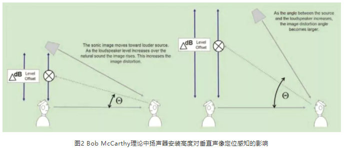 任何解決方案都存在一定的局限性。這些局限性主要來自于劇場(chǎng)的尺寸、舞臺(tái)的結(jié)構(gòu)、觀眾席座位的分布以及劇場(chǎng)的聲學(xué)環(huán)境等要素。使用中置揚(yáng)聲器對(duì)于那些舞臺(tái)鏡框特別高的場(chǎng)地可能不是一個(gè)好的選擇。吊掛的高度決定了聲源發(fā)出的位置(見圖2),若揚(yáng)聲器與觀眾席垂直方向的夾角大于30°,位于前排的觀眾就有可能會(huì)感覺到垂直方向上的聲像漂移,產(chǎn)生人聲或?qū)Π讈碜灶^頂而非前方的感覺。此時(shí),設(shè)計(jì)時(shí)可以考慮通過臺(tái)唇補(bǔ)聲系統(tǒng)來覆蓋前排觀眾席,中置系統(tǒng)從3排或4排之后的區(qū)域開始覆蓋。