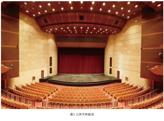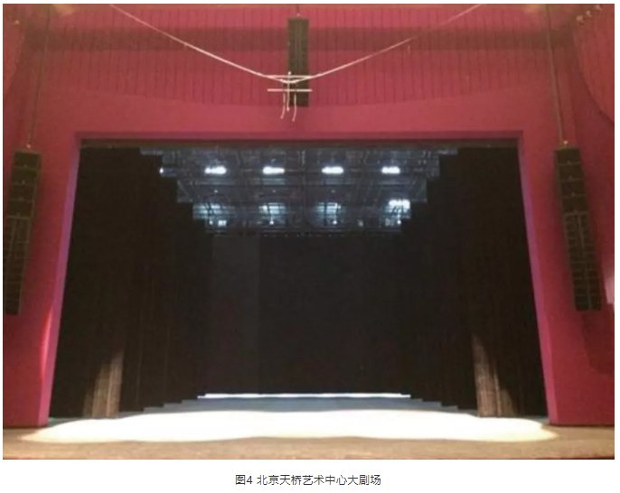標(biāo)準(zhǔn)劇場(chǎng)中,中置揚(yáng)聲器組的安裝通常分為暗裝和明裝兩種。暗裝一般是安裝在舞臺(tái)鏡框上沿預(yù)留的聲橋當(dāng)中,如北京天橋劇場(chǎng)(圖3)。明裝則是吊掛在舞臺(tái)燈桿或預(yù)留的吊點(diǎn)上,如北京天橋藝術(shù)中心大劇場(chǎng)(圖4)。暗裝對(duì)觀眾的視覺影響最小,如果劇場(chǎng)擴(kuò)聲系統(tǒng)設(shè)計(jì)合理,建筑聲學(xué)指標(biāo)達(dá)標(biāo),且在鏡框高度不是很高的情況下,劇場(chǎng)中置聲道暗裝是最好的安裝方式。但是國(guó)內(nèi)劇場(chǎng)的實(shí)際情況并不樂觀,且不同演出的系統(tǒng)工程師和音響設(shè)計(jì)師都有各自的設(shè)計(jì)和考量,暗裝中置聲道位置又基本不可調(diào)整,所以很多劇場(chǎng)中暗裝的中置聲道使用率很低。明裝的中置聲道更便于安裝、拆卸以及調(diào)整,更加適合流動(dòng)性強(qiáng)的演出,因此,越來越多的現(xiàn)代化劇場(chǎng)采用這種安裝方式。