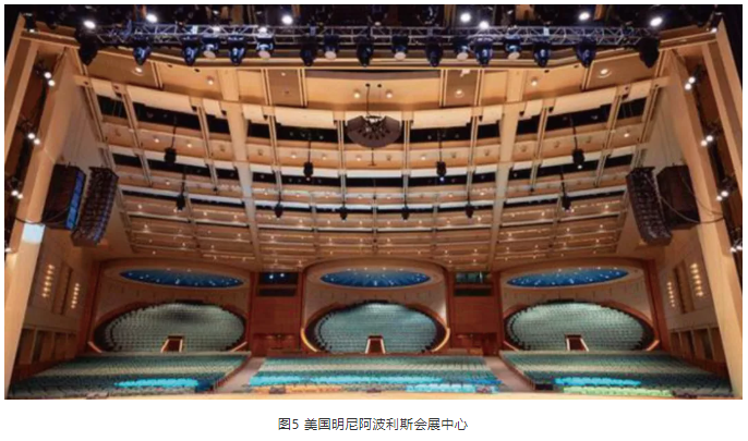 此外,還有一些劇場(chǎng)由于應(yīng)用場(chǎng)景的不同,揚(yáng)聲器系統(tǒng)既要減少舞臺(tái)垂直方向上對(duì)觀眾的視覺影響,還要滿足較寬觀眾席對(duì)水平覆蓋的需求。例如美國(guó)明尼阿波利斯會(huì)展中心使用ARCS恒定曲率線陣列揚(yáng)聲器,這種揚(yáng)聲器陣列在垂直方向上的輻射角度不可調(diào)整,但水平角度上中置揚(yáng)聲器幾乎可以覆蓋到整個(gè)觀眾席,甚至可以比左右聲道揚(yáng)聲器承擔(dān)更大的功率,這對(duì)于以語(yǔ)言類為主的會(huì)議等應(yīng)用場(chǎng)景來說是十分方便且有效的。