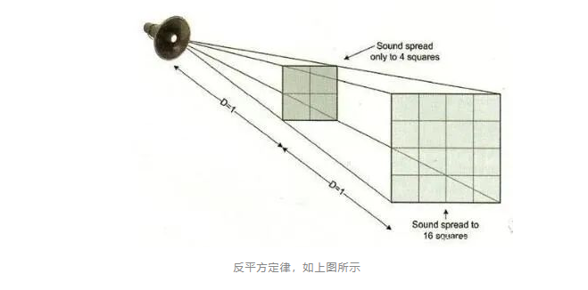 如果距離聲源的距離每增加一倍,那么聲功率就會減少為原來的四分之一,我想這一點很多人都是知道的。這一定律幾乎可以適用于所有的地方,無論是麥克風還是揚聲器陣列。了解這一定律,對于我們確定功率放大器所需的功率十分重要。