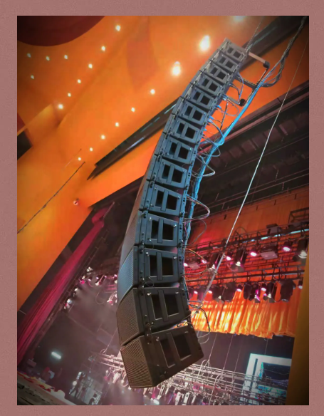 主擴(kuò)系統(tǒng)采用左中右三組線陣列揚(yáng)聲器結(jié)合覆蓋的方式,其中左右聲道每組吊掛14只