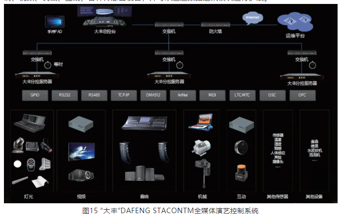 除了大型全媒體系統的功能融合日益完善和強大,一些以傳統舞臺機械操控為核心的綜合控制系統也融合了多種新技術新手段,有效解決了舞臺機械系統與燈光音響等非機械設備的同步演出問題。
