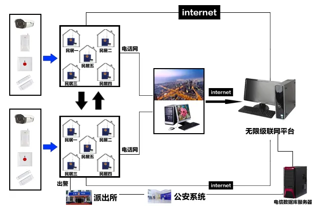 周邊防范:來訪者通過別墅門口機(jī)呼叫,業(yè)主確認(rèn)后開門,其他非法入侵都會引起警報(bào)(別墅門口機(jī)和大門紅外對射關(guān)聯(lián),開鎖后撤防,上鎖后,自動布防)。