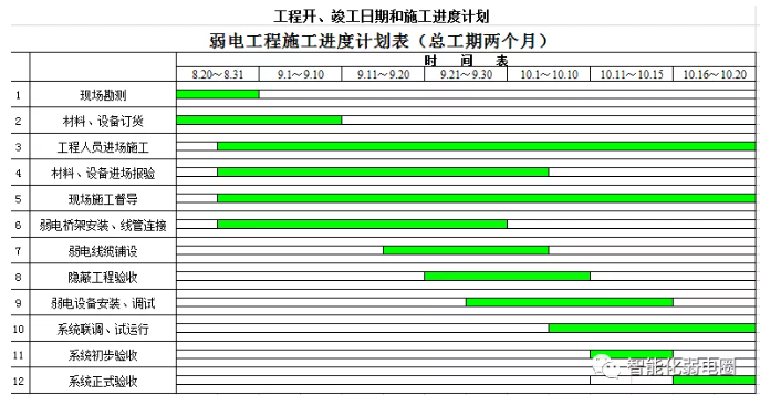 施工進(jìn)度階段劃分:會(huì)描述弱電項(xiàng)目的總工期,以及項(xiàng)目需要分為多個(gè)階段進(jìn)行,比如施工準(zhǔn)備、技術(shù)交底、安全培訓(xùn)階段,穿線、配管階段,設(shè)備安裝階段,系統(tǒng)調(diào)試、試運(yùn)行及整改階段,以及人員培訓(xùn)、竣工驗(yàn)收等階段。
