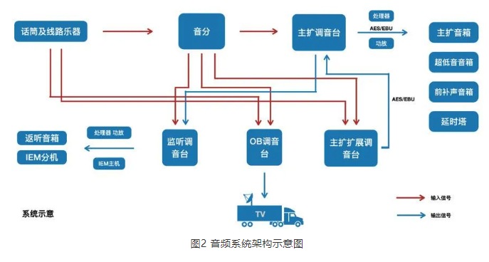 還有一種比較常見的擺位,在1777年由德國作曲家阿貝福格勒提出,19世紀下半葉被廣泛采用,通常稱之為歐式(德式)擺位。這種擺位關系下,有利于首席小提和首席大提、大提和貝斯的交流,特別是在合奏樂段的部分。在該演出中,一提和二提兩組相對而坐,會有一提二提一問一答的樂段,使聲像形成立體效果,且由于二提的f音孔朝向舞臺內側與f音孔朝向觀眾的一提音色也有著微妙并明顯的差異。任何一種擺位都無法十全十美,直到現在對于采用哪種擺位方式,音樂家們還多有爭執。一種觀點認為,德式的擺位需要得到側墻面的支持,對于音樂廳建聲環境要求較高;還有一種觀點認為,美式的擺位雖然能夠更加容易分辨不同的樂器組,但會使樂隊右側低頻較重,導致空間上的不平衡。一場音樂會同時演奏橫跨不同時期的曲目,這些曲目創作和演奏時的樂團擺位都不盡相同,例如上文提到的一提和二提一問一答的效果很容易湮沒在其他擺位中相鄰的聲部里。但現場隨著曲目的要求變換樂隊擺位并不現實,采用電聲系統的調整可在一定程度上彌補改善擺位帶來的缺點,通過調節EQ、混響、PAN等手段能夠實現各個聲部相對定位關系的改變,從而更好地表現不同作品。例如上文提到的一提和二提一問一答效果的實現(當然要注意點補傳聲器和主傳聲器的關系調整,也需要在效果和回授前有效增益之間找到平衡),以及特定擺位帶來的空間不平衡,再加之合理地使用如DearVR MICRO等融入HRTF( Head-Related Transfer Function )原理的空間模擬插件,從而“創造”出不同的空間體驗。根據美式擺位,合唱團一般會由女聲站在男聲前面,按照從左到右女高音-女中音-男高音-男低音來獲得平衡。對于合唱團來說,音色統一和聲音足夠清晰是比較重要的。合唱由多個非相干聲源組成,雖然團員按照站位排開,但在空間上對某一個團員甚至一個聲部進行分辨都是困難的。在音樂廳的舞臺上,由于側墻及返聲板的反射,合唱給人以包圍感、融合感。但在戶外的環境里沒有了這些反射聲,合唱的音效就要通過拾音、混音實現。合唱團的拾音一般只是3~4支傳聲器,拾音距離按照3∶1規則分布,以減少相位抵消。通常情況下,離傳聲器較近,尤其在傳聲器軸線的合唱演員聲音會較為突出,使得整個合唱在整個系統里的定位固定,群感融合度不夠。通過使用壓縮器修整冒尖的聲音,通過使用效果器來模擬早期反射聲,以提高整體的融合度。室外的現場擴聲體驗與音樂廳內“沉浸”的聽聞感受有著從底層邏輯上的不同。音樂廳內的現場體驗決定于音樂廳的聲學環境及聽音位置。室外現場擴聲體驗決定于拾音、混音技巧以及擴聲系統的設計,通過技術手段實現聲場的重構、再構,達到聽聞的一致性。隨著電聲技術發展,將給現場聽聞帶來更豐富、更舒適的體驗,亦如當年技術發展(動力學、材料學,甚至是建筑技術)對于歐洲樂器制作、演奏、作曲技法乃至音樂風格產生深遠而持久的影響。2.3.2 拾音的設計思路由于調音臺輸入通道的限制,沒有對每一件樂器進行單獨拾音,采用對聲部首席及前檔、對聲部整體拾取的方案,見圖5;除去演出流程相關無線傳聲器、視頻等,樂團合唱團以及獨奏共使用72個通道,見表1。由DPA4006C作為主傳聲器,SCHOEPS MK2s用于側展,相當于與主傳聲器形成了一個大的Decca Tree拾音制式。主傳聲器負責整個樂隊的基準平衡,側展傳聲器用于構建樂團的空間效果。
