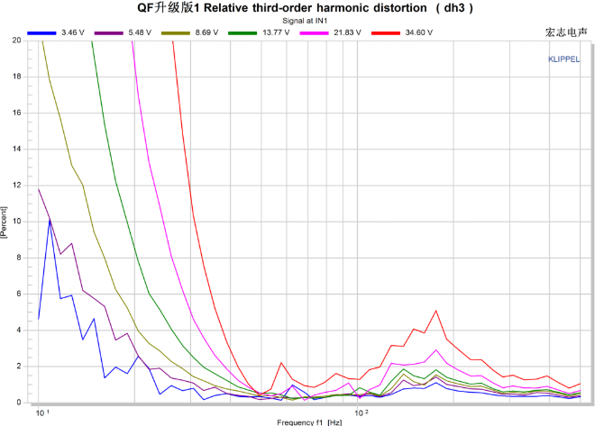 上圖是一個喇叭的輸入電壓跟失真的關(guān)系圖,不同顏色的線代表不同電壓,可以看到,隨著輸入電壓的增大,失真跟著增加。