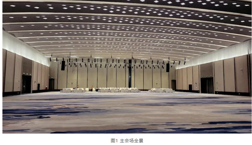 主會場設有活動隔斷,可將會場一分為二,因此需考慮大會和分會兩種不同使用模式下擴聲系統的構成。其擴聲系統聲學設計指標,按照國家標準GB 50371— 2006《廳堂擴聲系統設計規范》[1]中多用途類擴聲系統聲學特性指標“一級”。
