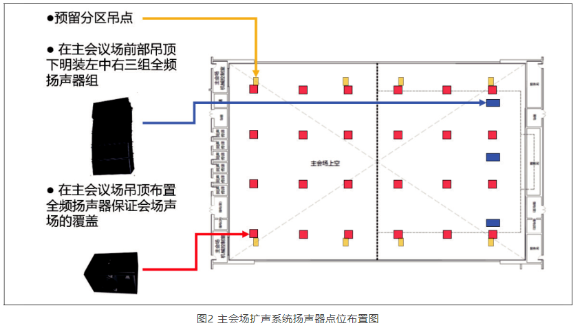在大會模式下,主揚聲器系統采用左中右三聲道方式,由24只線陣列全頻揚聲器和4只次低頻揚聲器組成,分別通過電動葫蘆吊掛于主席臺前沿頂部。主揚聲器系統吊點位置參照主席臺區域布置,并錯開主通道區域上方空間。同時,在會場吊頂內暗裝24只大功率全頻揚聲器分散均勻覆蓋全場,可與主揚聲器系統互為補充,如圖2所示。