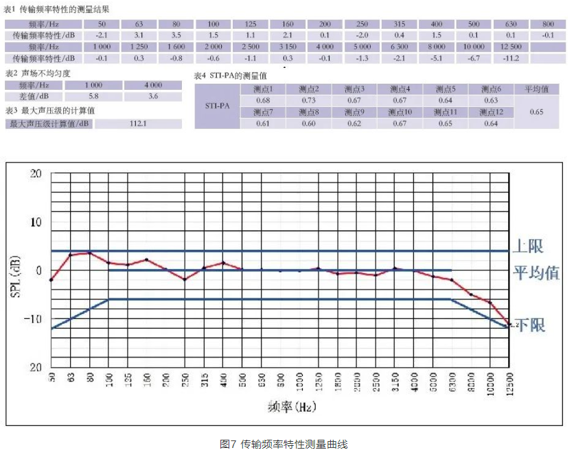 擴聲系統安裝調試完畢后,筆者對主會場進行了擴聲系統指標現場測試。由于主席臺區域會議發言位置未確定,此次測量并未包含傳聲增益指標,測量結果見表1至表4、圖7。擴聲系統各項指標均達到設計目標及行業相關標準指標。