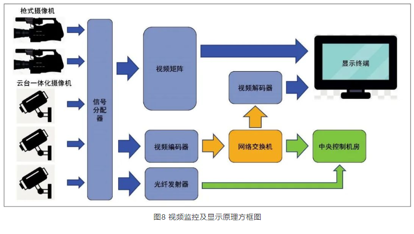 視頻監控系統框架如圖8所示,視頻采集信號通過本地H D M I分配器,一路送至音視頻控制室視頻矩陣,另一路送至分布式視頻信號接收器,接入會議中心分布式視頻網絡。送至音視頻控制室的視頻信號,送至本地控制室監視器、同傳間監視器、舞臺機械控制室監視器、本地會場墻面綜合插座箱等。送至分布式視頻信號接收機的視頻信號,通過會議中心音視頻網絡送至中央控制機房,并保留本地視頻信號光纖鏈路,可通過光收發設備直傳至中央控制機房。