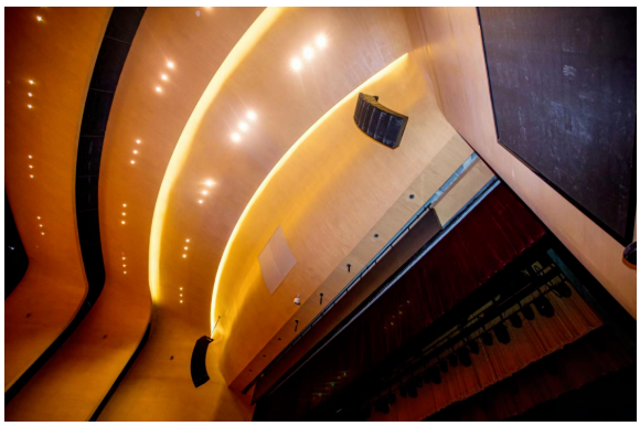左右聲道主擴聲系統選用KF810P | 110 Black線陣列揚聲器,左右各8只吊裝于舞臺口兩側。中央聲道選用了2只EAW QX594I全頻揚聲器,吊掛安裝于舞臺口上方聲橋內的中央位置。這兩個系列的揚聲器均具有極高聲壓輸出,成為中等距離投射揚聲器的合適選擇;同時,其寬頻帶指向控制能力可使其更好地駕馭惡劣的聲學環境;卓越的保真能力更是得到了音樂廳和表演藝術中心最專業、最挑剔聽眾的首肯。