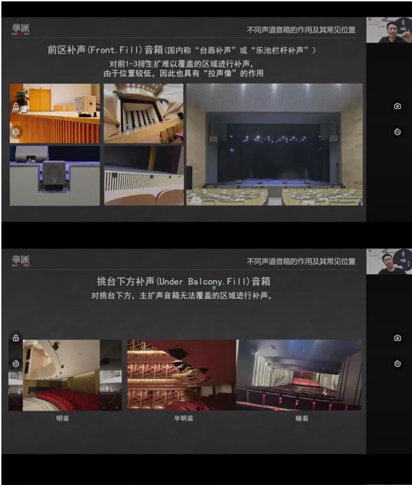 ·前區(qū)側(cè)補(bǔ)(In.Fill)音箱,為主擴(kuò)揚(yáng)聲器覆蓋不到的區(qū)域進(jìn)行補(bǔ)聲。由于位置較低,因此具有“拉聲像”的作用。