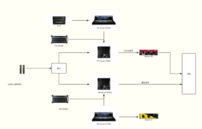 OB調音臺至擴聲系統通過傳統的模擬信號進行傳輸,并在OB房間的S7000臺面上加裝了一張Waves卡 用于OB混音。