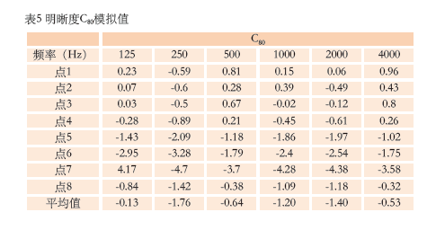 從表5可以看出,各接收點明晰度C80平均值各頻率均在-3 dB~0 dB之間,滿足要求。但是,各接收點明晰度差距較大,其中部分接收點C80不在-3 dB~0 dB范圍內,這是由于聲聚焦音質缺陷造成的。