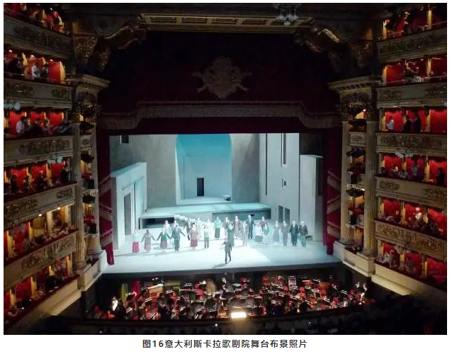 對于歌劇演出來說,舞臺上的聲學(xué)條件很重要,尤其是對歌手來說。舞臺內(nèi)唯一可能為歌手提供早期反射的表面就是舞臺布景,所以一般都會設(shè)置類似反聲罩的布景(見圖15、16)。這種措施不僅是歌劇劇情演出的需要,還可以起到提高歌手之間的相互聽聞和響度的作用。