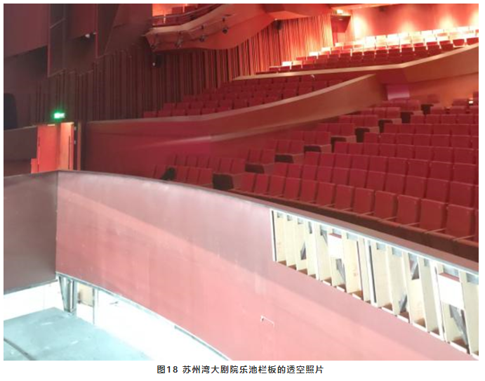 由于樂池的下沉,歌手和樂隊(duì)彼此之間大多數(shù)看不到對方,也就是說他們之間缺乏直達(dá)聲進(jìn)行交流,通過反射面提供<35ms的早期反射聲進(jìn)行交流就至關(guān)重要。樂池欄板是歌手和樂隊(duì)之間最近的反射面(見圖17),因此欄板必須是硬的反射面。蘇州灣大劇院樂池的右側(cè)欄板采用透空做法(見圖18),優(yōu)點(diǎn)是可以提高了樂隊(duì)的聲級特別是高頻聲,增加樂隊(duì)演奏聲的亮度。但是卻產(chǎn)生了三個不利因素:一是打破了歌手和樂隊(duì)之間的平衡,使樂隊(duì)聲能可能蓋過了歌手;二是減少了歌手和樂隊(duì)之間的早期反射聲交流,不利于演出的同步性;三是觀眾可以隱約看到樂譜燈光,干擾觀看演出。綜合考慮這種做法并不可取。