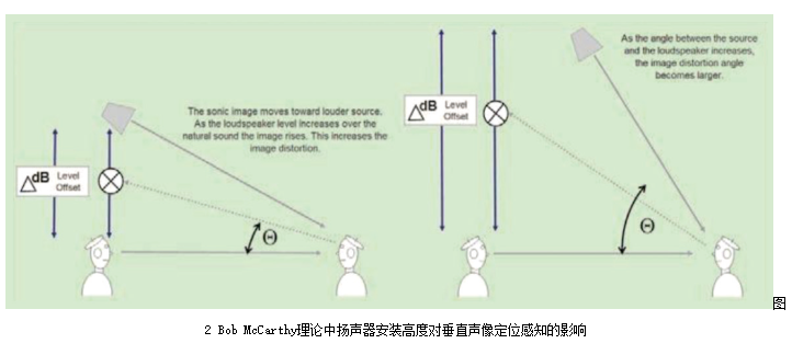 任何解決方案都存在一定的局限性。這些局限性主要來自于劇場的尺寸、舞臺的結構、觀眾席座位的分布以及劇場的聲學環(huán)境等要素。使用中置揚聲器對于那些舞臺鏡框特別高的場地可能不是一個好的選擇。吊掛的高度決定了聲源發(fā)出的位置(見圖2),若揚聲器與觀眾席垂直方向的夾角大于30°,位于前排的觀眾就有可能會感覺到垂直方向上的聲像漂移,產生人聲或對白來自頭頂而非前方的感覺。此時,設計時可以考慮通過臺唇補聲系統(tǒng)來覆蓋前排觀眾席,中置系統(tǒng)從3排或4排之后的區(qū)域開始覆蓋。