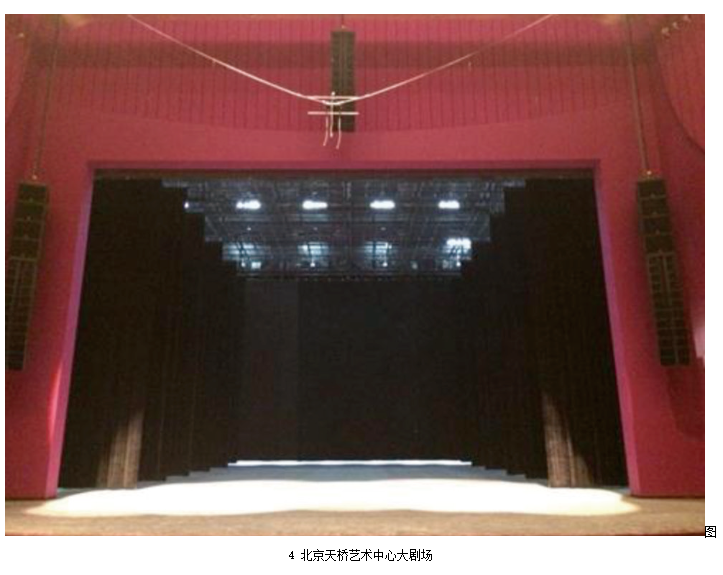 標準劇場中,中置揚聲器組的安裝通常分為暗裝和明裝兩種。暗裝一般是安裝在舞臺鏡框上沿預留的聲橋當中,如北京天橋劇場(圖3)。明裝則是吊掛在舞臺燈桿或預留的吊點上,如北京天橋藝術中心大劇場(圖4)。暗裝對觀眾的視覺影響最小,如果劇場擴聲系統(tǒng)設計合理,建筑聲學指標達標,且在鏡框高度不是很高的情況下,劇場中置聲道暗裝是最好的安裝方式。但是國內劇場的實際情況并不樂觀,且不同演出的系統(tǒng)工程師和音響設計師都有各自的設計和考量,暗裝中置聲道位置又基本不可調整,所以很多劇場中暗裝的中置聲道使用率很低。明裝的中置聲道更便于安裝、拆卸以及調整,更加適合流動性強的演出,因此,越來越多的現(xiàn)代化劇場采用這種安裝方式。