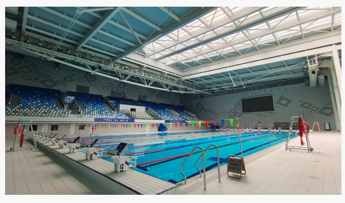 清遠奧體中心游泳館分為地下一層,地上三層,可容納2000人觀賽。游泳館比賽池上空采用大跨度可開合活動屋蓋,開合跨度寬達24米,能在5分鐘內實現室內與露天泳池的切換,是一種新型的可變形態建筑。